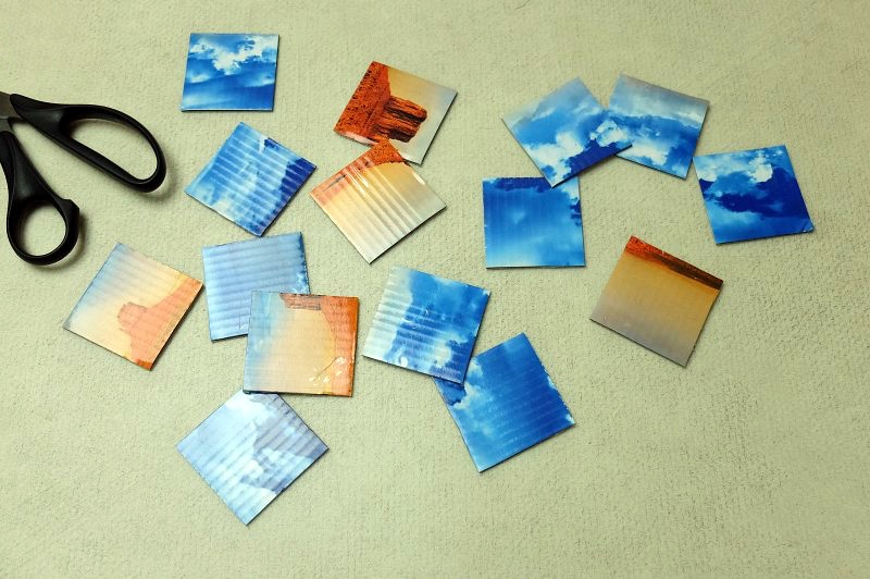 5) Odstraňte z magnetické samolepicí pásky ochrannou fólii a nalepte ji zezadu na každý dílek budoucího magnetického puzzle. Hezky přitlačte, ať lepidlo dobře drží.